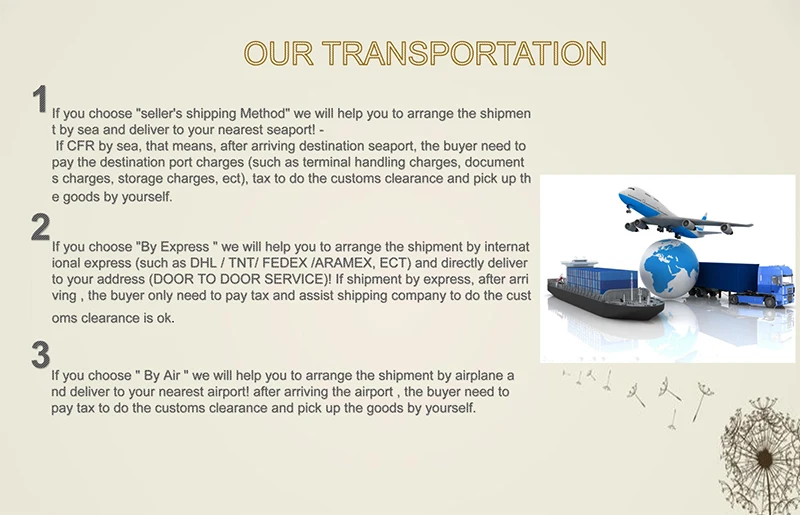 2.If you choose "By Express " we will help you to arrange the shipment by international express (such as DHL / TNT/ FEDEX /ARAMEX, ECT) and directly deliver to your address (DOOR TO DOOR SERVICE)! If shipment by express, after arriving , the buyer only need to pay tax and assist shipping company to do the customs clearance is ok.